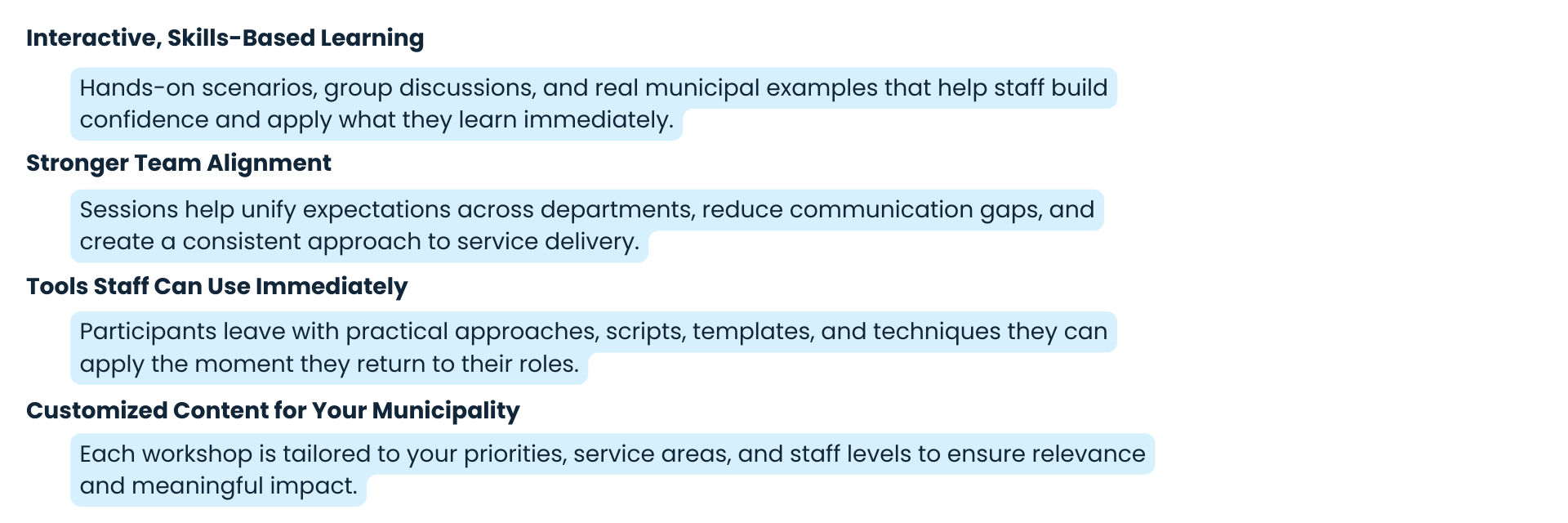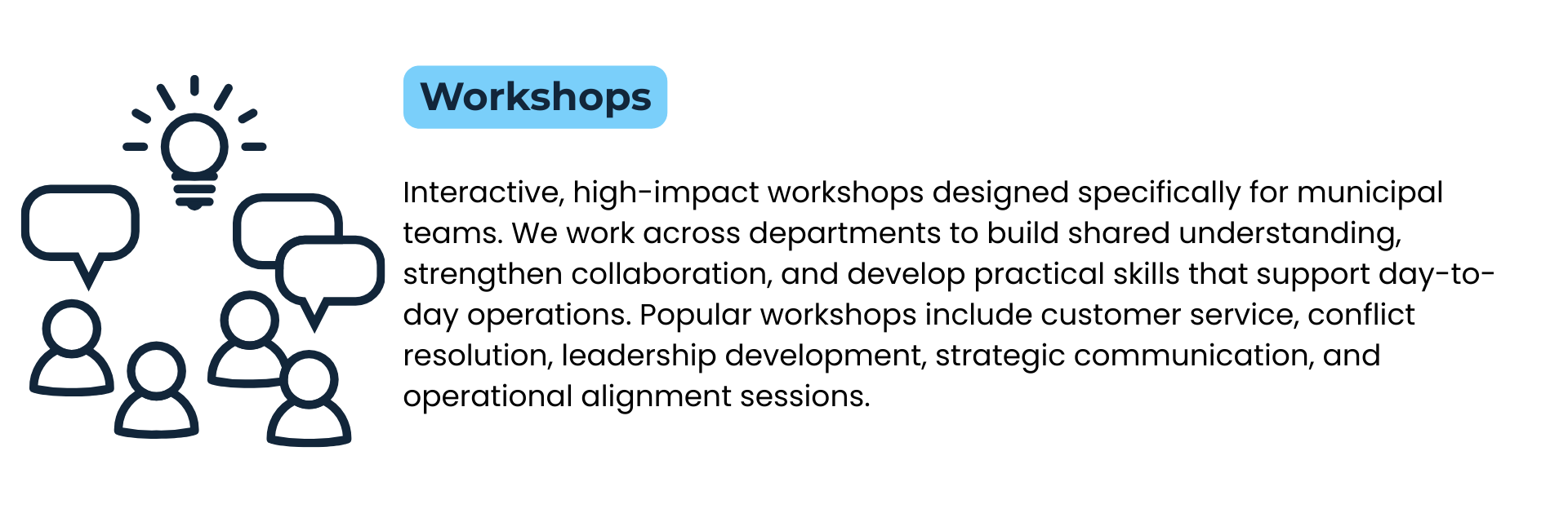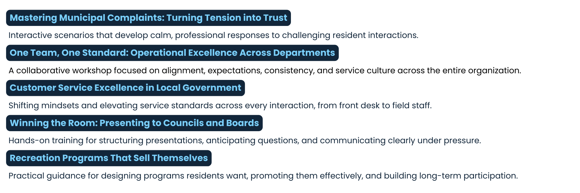 Our workshops are built for real municipal work and designed to strengthen staff skills, improve communication, and support organizational success.